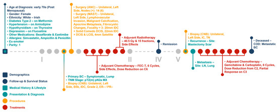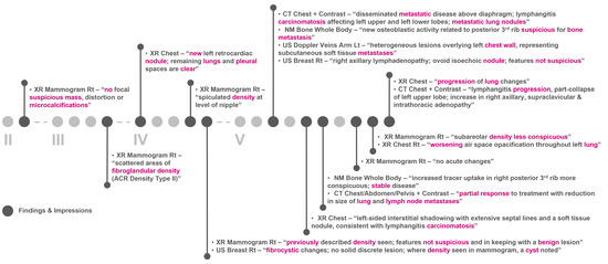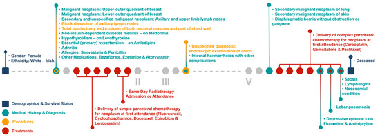 Figure 6 and Figure 7 show the clinical patient journey narratives for Patient A based on the structured and unstructured parts (specifically imaging reports) of their EHRs from BH, respectively. EHRs differ from biobank data in terms of what information is recorded, and when and how this information is recorded: compared to BCNTB-BCI data, EHRs from BH provide a better coverage of clinical events, which makes them suitable for certain studies (e.g., comorbidity analysis); however, they are not necessarily cancer-specific, and therefore, require filtering before they can be used to visualise cancer patient trajectories. In BCNTB-BCI data, clinical events appear sooner and with a single date, whereas in EHRs from BH, codes may have been entered multiple times with different dates. As a cancer-oriented biobank, BCNTB records cancer-related information explicitly and mostly in a structured format, while in EHRs, the same information may not be directly available or are recorded in an unstructured format. For instance, BCNTB-BCI records age at diagnosis, family history of cancer and treatment regimen, including the response and any side effects, explicitly. In contrast, using EHRs from BH, we calculated age at diagnosis based on date of birth and date of the earliest instance of the relevant diagnosis code. Likewise, we filtered family history data by relation (first-degree relative or otherwise) and disease to obtain cancer-specific family history information. Similarly, drugs that are part of the same regimen are not grouped together, and the response to treatment and any side effects are usually mentioned in free-text reports; we extracted and aggregated this information.