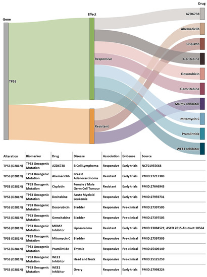 Using 100K GP data, we identified somatic variants for Patient A using the Analytics Hub. These variants were used as input query set to the Cancer Genome Interpreter (CGI, release 28) [29], which produced a list of potential therapeutically actionable candidates. In the case of this patient, TP53 D281N variant was listed as a biomarker of drug response. Figure 8 shows the drug sensitivity profiles for this variant. According to EHRs from BH, the patient was administered a combination chemotherapy regimen of carboplatin, gemcitabin and paclitaxel, and according to BCNTB-BCI data, the patient had an initial partial response followed by disease progression and died shortly after. The predictive power of TP53 mutations has not yet been sufficiently validated to permit conclusions on the pharmacogenomics to be drawn. Genomic insights, in conjunction with information from other sources (e.g., biobank data and EHRs), not only provide researchers with richer datasets, but also guide clinicians in their diagnosis and management decision-making process.