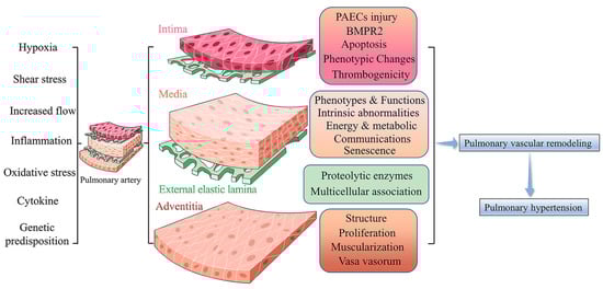 Pulmonary Vascular Remodeling in PH Pathogenesis. Under a variety of stimuli, such as hypoxia, inflammation, and oxidative stress, the pulmonary artery vasculature undergoes pathological changes in function and structure, leading to pulmonary vascular remodeling and ultimately promoting PH.