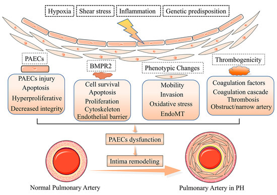 The intima represents the thick interface of endothelial cells between the media and flowing blood. The endothelial cells provide a broad unobstructed flow surface area, contributing to the suitable perfusion pressure that is the normal state of pulmonary circulation [7]. Patients with severe PH have an approximately 3 fold increase in pulmonary intima, but the mechanism of intima damage is unclear [8] and intimal thickening will result in an approximately 40-fold increase in resistance of the pulmonary vascular. There are various types of intimal thickening and PAECs dysfunction, as the most critical component of the intima accelerates the process of intima remodeling [9]. Under normal physiological conditions, PAECs are in a steady state and secrete a variety of active factors that disturb PAECs and PASMCs proliferation, coagulation, the attraction of inflammatory factors and activation of vasoactivity, which leads to dysfunction and pathological changes of PASMCs in PH [10]. Multiple factors trigger PAECs dysfunction in PH [11,12,13,14], such as shear stress, hypoxia, inflammation, PAECs phenotypes, the bone morphogenic type 2 receptor (BMPR2), and cilia length [15,16,17] (Figure 2). Meanwhile, the deterioration of endothelial metabolic function in the pulmonary vascular system is becoming an important driver of PAECs dysfunction and PH development [18].