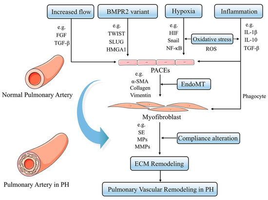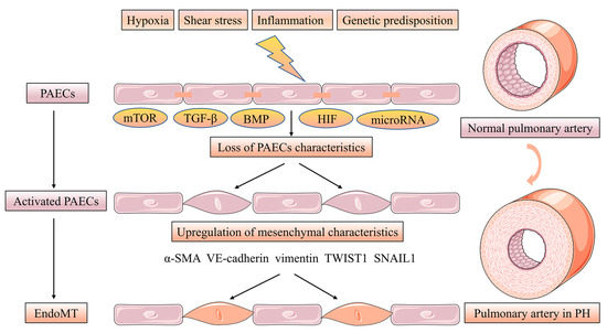 Multiple stimuli involved in the course of PH initiate the process of EndoMT. Loss of BMPR2 function has been demonstrated to activate EndoMT [128]. Inhibition of BMPR2 properties in PAECs leads to elevation of high-mobility group AT-hook 1 (HMGA1), a protein that promotes the biosynthesis of a transcriptional regulatory molecule called Slug that increases the amount of α-SMA, accompanied by suppression of endothelial cell genes, as well as the platelet endothelial cell adhesion molecule and vascular endothelial cadherin, ultimately exacerbating the mesenchymal phenotype. Elevated expression levels of the transcription factor Twist can inhibit the biological activity of BMPR2 in EndoMT. Furthermore, stimulation of chronic hypoxia initiates EndoMT by increasing the levels of Snail, β-catenin, NF-κB and STAT3, which regulated by HIF and TGF-β signaling [129]. Inflammation and oxidative stress cytokines such as IL-1β, IL-6, IL-10, TNF-α and ROS contribute to EndoMT via activation of TGF-β mediated inflammatory response and oxidative stress damage.