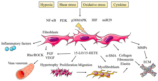 Activated fibroblasts promote adventitia remodeling in PH. During the period of vascular remodeling induced by PH, PAFs are highly activated and undergo phenotypic transformation characterized by hyperproliferation, migration and inflammatory activities under the regulation of multiple signaling pathways, which also affects vasa vasorum and ECM in adventitia.