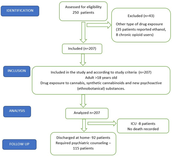 Being one of the largest centers in the county, we can state that all eligible patients exposed to cannabis, new psychoactive substances and synthetic cannabinoids were included in this study. One eligibility criterion was represented by the first medical consultation that had to take place within the ED “St. Spiridon”.