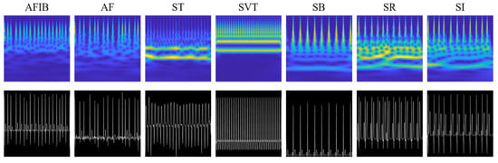Sample images of scalogram and ECG grayscale images for the 7 groups of ECG recordings (AFIB, AF, ST, SVT, SB, SR, and SI). Each column represents the AFIB, AF, ST, SVT, SB, SR, and SI categories. The first row shows scalogram images and the second row displays grayscale images of the ECG signals.