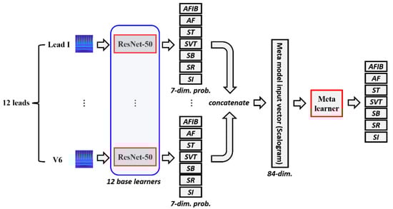 Since we propose a multi-modal stacking ensemble method for diagnosing CVDs, we focus on a stacking ensemble. In this study, we use two types of image modalities: scalogram images and ECG grayscale images. The single-modal stacking ensemble refers to the stacking ensemble that utilizes only one image modality, whereas the multi-modal stacking ensemble refers to the stacking ensemble that incorporates two image modalities. We first explain the single modal stacking ensemble, and, to ensure clear understanding, we specifically describe the scenario where the input is a scalogram image. As shown in Figure 2, scalogram images are fed to a pretrained ResNet-50 model to be fine-tuned for each lead. Since we have 12 leads, 12 ResNet-50 base learners are fine-tuned with scalogram images. We can then obtain 12 predictions from 12 individual base learners. Each base learner’s prediction is a 7-dimensional probabilities vector. Considering 12 leads, we can obtain 12 predictions that consist of 7-dimensional probability vectors. Simple averaging ensemble averages the predictions of 12 single-lead ResNet-50 models that were independently trained. On the other hand, the stacking ensemble combines the predictions of the 12 base learners. That is, the 7-dimensional output probability vector from each lead is concatenated to make an 84-dimensional vector. Then the 84-dimensional vector is fed into a meta learner that outputs prediction values for the 7 ECG rhythms. As the meta learner, logistic regression, support vector machines (SVM), random forest, and XGBoost were employed in this study [,,,]. The single-modal stacking ensemble architecture for ECG grayscale images is the same as described above, except that the input image is an ECG grayscale image instead of a scalogram image.