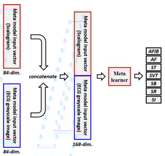 Single-modal stacking ensemble considers only one input modality, whereas multi-modal stacking ensemble methods take multiple input modalities into account. A detailed description of the multi-modal stacking ensemble is depicted in Figure 3. In this study, scalogram images and ECG grayscale images are used as two input modalities. In the proposed multi-modal stacking ensemble, we combine an 84-dimensional vector obtained from 12 individual base learners using scalogram images and another 84-dimensional vector attained from 12 individual base learners using ECG grayscale images. Combining the vectors obtained from the two modalities results in a 168-dimensional vector. The concatenated 168-dimensional vector contains the characteristics of a scalogram image and an ECG grayscale image. The 168-dimensional vector becomes the new input vector for the meta learner. Similar to the single-modal stacking ensemble, the multi-modal stacking ensemble employed logistic regression, SVM, random forest, and XGBoost as meta learners in this study.