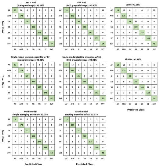 Confusion matrices of two single leads (Lead II lead for scalogram image and aVR lead for ECG grayscale image), LSTM, BiLSTM, a single-modal stacking ensemble with random forest (RF) for scalogram images, a single-modal stacking ensemble with logistic regression (LR) for ECG grayscale images, multi-modal simple averaging ensemble, and a multi-modal stacking ensemble with logistic regression.