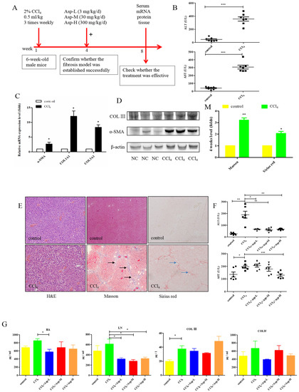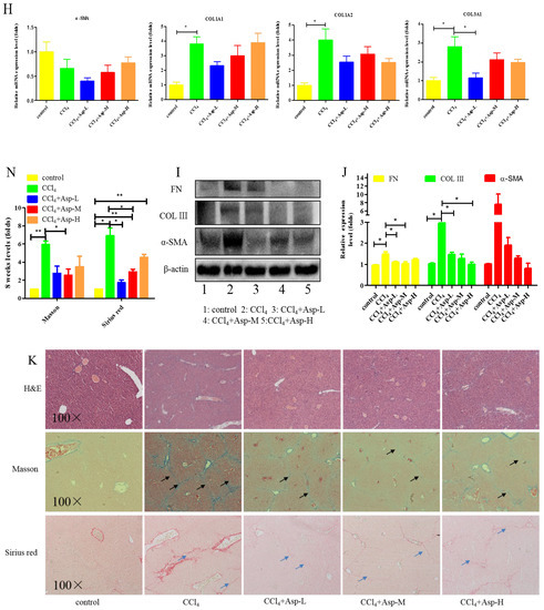 Asp supplementation protects against CCl4-induced liver fibrosis in mice. (A) Schematic illustration of animal models in mice. (B,F) The activities ALT and AST were assayed by using a semi-automated blood chemistry analyzer. (G) The serological levels of HA, LN, COL III and COL IV were detected. (C,H) The expression of the myofibroblast marker α-SMA and collagen was detected by real-time PCR. (D,I) Protein levels in liver tissues were analyzed by Western blot analysis, (J) which were quantified using the ImageJ software. (E,K) Liver tissues were harvested 48 h after the final CCl4 injection and stained with hematoxylin–eosin, Masson Black arrow (Black arrow), and Sirius Red (Blue arrow) (×100). (L) Liver fibrosis was observed by immunohistochemical staining of α-SMA/COL III-positive cells. (M,N) The Sirius red and Masson-stained area in treated and non-treated animal have been quantified using the Image J software. Data represent the mean ± SD from 6 to 8 separate experiments (significant as compared with vehicle-treated control, * p < 0.05, ** p < 0.01; *** p < 0.001 by ANOVA).