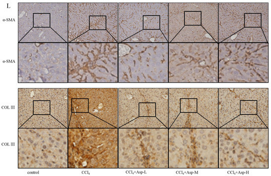 The present experiments employed CCl4 -treated mice, a liver fibrosis model which is nonlethal and has milder features than the DMN model, and bile duct ligation models [20]. To explore the reversibility of CCl4-induced liver fibrosis and the dose of Asp, a preliminary animal experiment was conducted. We observed that severe liver fibrosis and cirrhosis were difficult to reverse, so the degree of liver fibrosis was controlled during the formal animal experiments. In this clinically relevant model, CCl4 treatment for 4 weeks induced liver fibrosis, as indicated by serum parameters of hepatocyte damage (ALT and AST levels) and histological indicators, whereas the concomitant administration of Asp significantly inhibited hepatocyte damage. Moreover, it could inhibit the HSC activation and ECM aggregation of CCl4-induced fibrosis. The therapeutic effects of Asp cannot be ignored, although CCl4-induced liver fibrosis was not severe enough in our experiments. The accumulation of ECM is the main marker of liver fibrosis, and the activation of HSCs is a prerequisite of this phenomenon [21,25]. In the normal liver, HSCs are not fibrogenic and store vitamin A. However, repeat injury stimulates inflammatory processes, such as the production of toxic cytokines and the recruitment of inflammatory cells. During these processes, HSCs are activated and have fibrogenic characteristics, indicating their transition to myofibroblasts [26]. In the present study, the oral administration of Asp to mice blocked CCl4-induced collagen deposition, as assessed by immunohistochemistry with Sirius red, Masson and COL III staining (Figure 1K,L). Furthermore, Asp inhibited the protein expression of α-SMA in partially activated LX-2 cells. TGF-β is the most important fibrogenic stimulator [27]. Activated HSCs represent a major cellular source of TGF-β in animals and humans with liver fibrosis [1]. Asp supplementation abrogated the TGF-β1-induced increase in α-SMA and collagen production, implying that Asp inhibited HSC transformation into myofibroblasts.