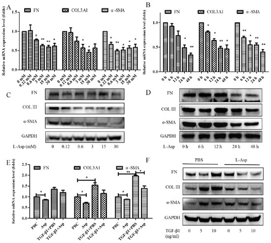 Inhibitory effect of Asp on HSCs activation in vitro. (A–D) LX-2 cells were treated with Asp in different concentrations or at different time. (E,F) LX-2 cells were treated with 5 ng/mL TGF-β1 for 24 h and then treated with Asp for another 24 h. (A,B,E) Real-time PCR was assessed to investigate mRNA level of α-SMA, COL III, and FN. (C,D,F) Western blot was assessed to investigate the protein level of α-SMA, COL III, and FN (n = 3). The results shown are the mean ± standard error. * p < 0.05, ** p < 0.01.