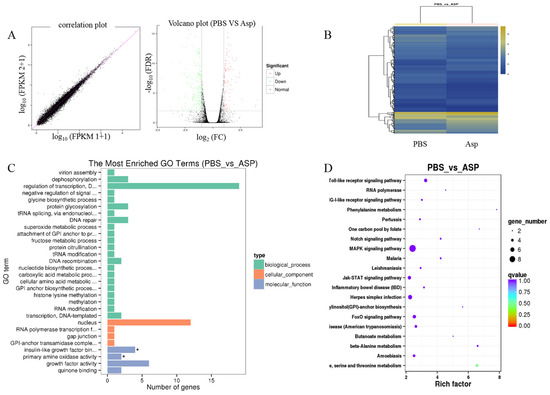 Gene expression profiling using RNA-seq. (A) Scatter plots of all expressed genes. Statistics for upregulated and downregulated genes among PBS vs. Asp. (B) Hierarchical clustering of differentially expressed genes. (C) GO functional classification on DEGs for each pairwise. (D) Scatter plot of the top 20 KEGG enrichment results of DEGs in each pairwise comparison. Differentially expressed genes were defined according to the combination of the absolute value of log2-Ratio ≥ 1 and FDR ≤ 0.001 The data are shown as the means ± SD of three biological replicates, * p < 0.05.