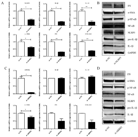Effects of si-NLRP3 on inflammation and liver fibrosis in LX-2 cells. LX-2 cells were transfected transiently with siRNA-NLRP3 for 48 h. (A) Real-time PCR analysis showed that the levels of NLRP3, IL-1β, IL-18, α-SMA, COL1A1 and COL3A1 mRNA were significantly downregulated by NLRP3 silencing. (B) The protein expression levels of α-SMA, FN, p-NF-κB, and IL-1β decreased dramatically after LX-2 cells were induced to down-express NLRP3. (C,D) Expression of the above genes at the mRNA and protein levels in LX-2 cells, when LX-2 cells were transfected transiently with siRNA-ARRB2 for 48 h (n = 3). Student’s t-test was used for statistical analysis. The results shown are mean ± standard error. * p < 0.05, ** p < 0.01.