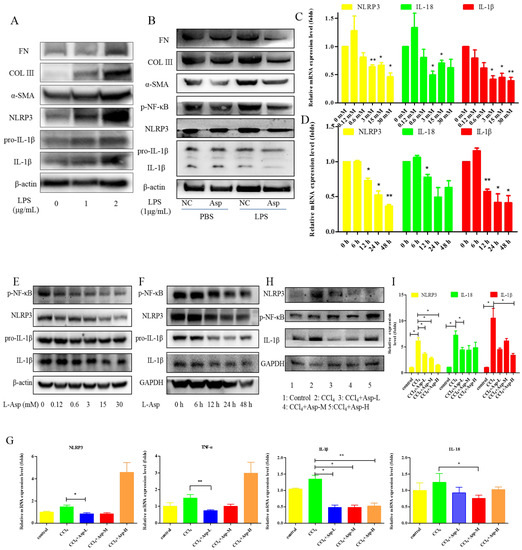 Treatment with Asp blocked hepatic NF-κB/NLRP3 expression in vitro and in vivo. (A) LX-2 cells were stimulated with lipopolysaccharide (LPS) (1 μg/mL or 2 μg/mL) for 6 h, and then the cells were collected to assess α-SMA, COL III, FN, NLRP3, and IL-1β expression levels by Western blot. (B) After 6 h of the addition of 1 μg/mL LPS, the medium was replaced with new medium in the presence or absence of Asp (15 mM), and the cells were incubated for an additional 24 h before harvesting. Protein levels were analyzed by Western blot analysis. (C–E) LX-2 cells were treated with Aspartate in different concentrations or at different times. (C,D) Real-time PCR was assessed to investigate the mRNA level of NLRP3, p-NF-κB, and IL-1β. (E,F) Western blot was assessed to investigate the protein level of NLRP3, p-NF-κB, and IL-1β (n = 3). (G–J) The expression of the inflammation markers NLRP3, p-NF-κB, IL-1β was detected by real-time PCR (G), Western blot (H), and immunohistochemistry (J), n = 5. ANOVA was used for statistical analysis. The results shown are mean ± standard error of the mean. * p < 0.05, ** p < 0.01.