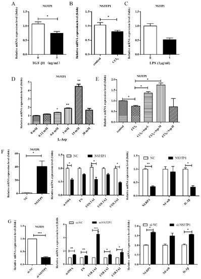 NS3TP1, also known as ASNSD1, is closely related to the metabolism of Asp [16]. Previous experiments confirmed that Asp could inhibit liver fibrosis. Therefore, we explored whether NS3TP1 was also associated with liver fibrosis. First, we detected the expression of NS3TP1 in fibrotic liver tissue and activated HSCs. As shown in Figure 6, the NS3TP1 expression level dramatically decreased in TGFβ1-stimulated LX-2 cells and CCl4-induced fibrotic disease models (Figure 6A,B), suggesting some association between NS3TP1 and liver fibrosis. More importantly, NS3TP1 was downregulated in LPS-induced inflammatory models but upregulated after the addition of ASP (Figure 6C–E). Next, whether NA3TP1 regulated liver fibrosis and liver inflammation was investigated. pcDNA3.1/myc-His-NS3TP1 (NS3TP1) and NS3TP1 siRNA (si-NS3TP1) were transfected into LX-2 cells, respectively, with respective negative controls. As the presently available NS3TP1 antibody did not work well, only qRT-PCR confirmed that NS3TP1 was successfully overexpressed or silenced in LX-2 cells (Figure 6F,G). Notably, the levels of α-SMA, FN, COL III, NLRP3, and IL-1β significantly decreased after NS3TP1 overexpression and strikingly increased after NS3TP1 knockdown compared with the control group (Figure 6F–I). Taken together, these results demonstrated that NS3TP1 suppressed HSC inflammation and ECM production in vitro.
