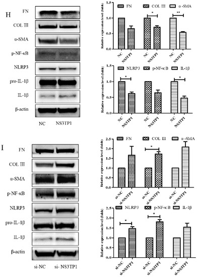 Asp inhibited liver fibrosis by upregulating NS3TP1 expression and then inhibiting the NF-κB/NLRP3 signaling pathway. (A–E) The expression of NS3TP1 was detected by real-time PCR. (F–I) LX-2 cells were transfected transiently with pcDNA 3.1/myc-His(−)-NS3TP1 plasmid or siRNA-NS3TP1 for 48 h. Real-time PCR (F,G) and Western blot (H,I) analysis of the mRNA and protein levels of genes about NF-κB signaling pathways and liver fibrosis in LX-2 cells, respectively, which were quantified using the ImageJ software, n = 3. The results shown are mean ± standard error. * p < 0.05, ** p < 0.01, *** p < 0.001.