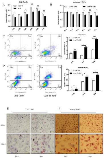 HSCs play a major role in liver fibrosis. They primarily store vitamin A in a quiescent or normal state. After activation, HSCs become proliferative and lose their typical star shape to be in a myofibroblast-like phenotype (MF-HSC) [1,22]. After confirming the inhibitory role of Asp in liver fibrosis, we further tested whether Asp inhibited liver fibrosis also via regulating the differentiation, activation, and proliferation of HSCs. First, we examined the effect of Asp on the growth of HSCs using CCK-8 assay. The treatment of LX-2 cells and primary HSCs with 15 mM Asp significantly inhibited cellular proliferation compared with control cells after supplementation for 12, 24, 36, 48 or 72 h (Figure 7A,B). The results showed that Asp markedly blocked the proliferation of HSCs. Second, the cell apoptosis was analyzed using flow cytometry. The total number of Annexin V-positive LX-2 cells and primary HSCs increased after adding 15 mM Asp compared with the control group treated with PBS, implying that Asp promoted cell apoptosis (Figure 7C,D). Next, we used an Oil Red O staining test to detect the lipid storage status of HSCs. Oil red O staining results in LX-2 cells and primary HSCs indicated that lipid droplet accumulation increased in cells treated with Asp compared with negative controls (Figure 7E,F). In a word, Asp not only dramatically reduced the level of proliferation but also induced apoptosis and significantly increased the lipid content close to the level in quiescent cells.