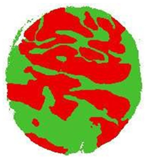 The objective proposed by the experts was to differentiate three regions of interest: the background, the tumor zone, and the non-tumor zone. Initially, the images only marked the tumor area, so it was necessary to create images marked with the three zones called “label images”. Initially, this task seemed trivial since having marked the tumor area (which is the most important), it would only be possible to mark the non-tumor area and the background; however, to try to avoid subjectivity, it was decided to automate the task with the processing program of GIMP images using its fuzzy selection tool: the label 0 (white) was assigned to the background area, then to the tumor area, as already marked; the label 2 (red) was assigned, finally leaving the non-tumor area that was selected by making an exclusion with the first zones, assigning the label 3 (green color). This procedure could be carried out in many ways. Therefore, no further details will be given. The labeling result for one of the original TMA images is shown in Figure 2.