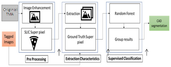 Initially, three image enhancement techniques were compared, of which histogram equalization significantly improved the final segmentation of the CAD system. Although image enhancement techniques were created to improve human visual interpretation, this study shows that they are also effective in improving interpretation by computational systems. A very interesting aspect is that the histogram equalization, unlike the other two techniques, does not “normalize” at the data set level but rather works independently on each image and, although its results are good, it would not be possible to know the result of trying one of them. In images with a difference too far from the rest of the set it is evident that the work with super pixel SLICs through which one goes from a pixel classification plane to one of the super pixels has been effective in capturing the redundancy of the TMA images as well as achieving a good adjustment to their different histopathological structures. It should be noted that this process could be improved in the future by optimizing the parameters of the SLIC method.