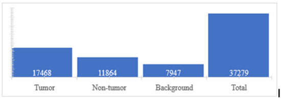 - Class assignment: In this step, the class variable (tumor, non-tumor, or background) was created and assigned to each feature vector (super pixel). For this, super pixel images were used, together with label images. The procedure consisted of taking the super pixel image by traversing each super pixel and interposing it over its corresponding area within the label image. This, in turn, has information on the class to which each pixel belongs, for which the number of pixels belonging to each class is counted through a voting system, and finally assigned to the super pixel the class that has the most votes. In other words, the class of the majority region to which the super pixel belongs is assigned.