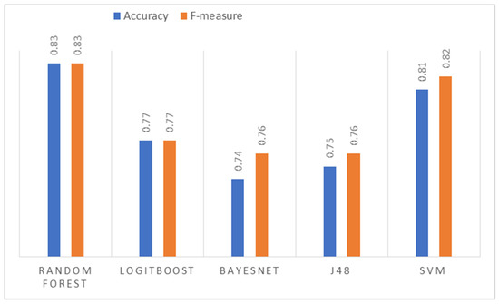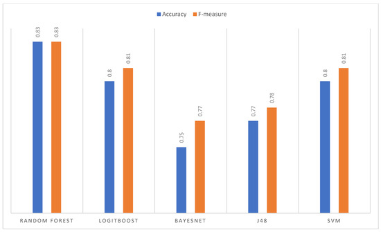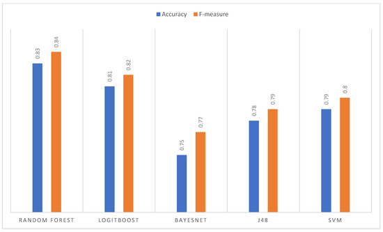 The precision obtained per image (sub-sample) for each algorithm using the normalized images as input. In this case, the algorithm that shows the best result is Random Forest, followed by SVM with similar behavior. The image best predicted by all the algorithms was nine, which indicates that in this iteration, the training obtained a good explanatory capacity from the other images. On the other hand, image 10 has the highest variance in its classification. Although it is one of the best classified by Random Forest and SVM (close to 90% accuracy), it is the worst classified by J48 and LogitBoost. The average performance for each algorithm is presented in Figure 7. The goodness measures indicate that the algorithm that obtained the best performance is Random Forest with an accuracy and F-measure of 83%, followed by SVM, LogitBoost, J48, and BayesNet.