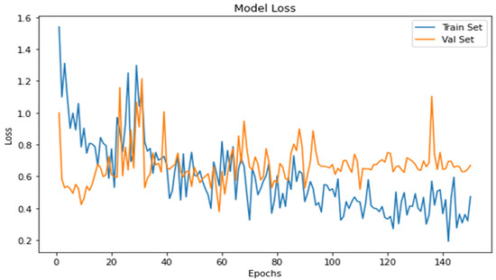 The cross-entropy function regulates the loss of a model and evaluates the model loss. From model loss (Figure 13), it is seen that the model loss lowers with an increase in time.