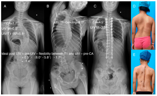 Representative LSI case in the retrospective study. (A) AP radiograph of the entire spine preoperatively. (B) Right bending. (C) AP radiograph of the entire spine postoperatively. (D,E) Clinical images of the same patient preoperatively and postoperatively. The ideal postoperative UIV tilt, calculated by the formula using the parameters measured in A and B, was −1.4 degrees. The actual postoperative UIV tilt was 2.5 degrees, and the postoperative CA tilt was 4.5 degrees.