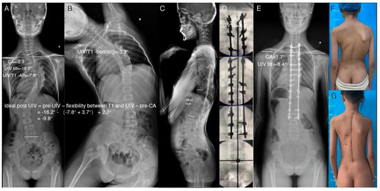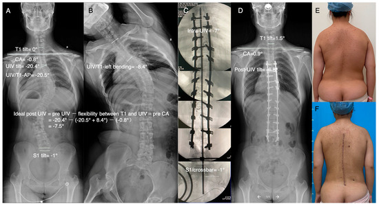 Standing and side-bending anteroposterior (AP) and lateral radiographs of the entire spine were obtained preoperatively, and standing AP and lateral radiographs were obtained immediately after surgery. The preoperative UIV tilt, preoperative CA, flexibility between T1 and the UIV, ideal postoperative UIV tilt, postoperative UIV tilt, and postoperative CA were measured [11,15] or calculated by the following formula: