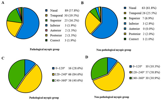 The proportion of lens dislocation direction and range in the Pathological myopic and Non-pathological myopic groups. (A) Lens dislocation direction in the Pathological myopic group, revealing most participants displayed nasal, temporal and superior lens displacements. (B) Lens dislocation direction in the Non-pathological group, revealing most participants displayed nasal, temporal and superior lens displacements. (C) Lens dislocation range in the Pathological myopic group, revealing most participants displayed moderate to severe range. (D) Lens dislocation range in the Non-pathological myopic group, revealing most participants displayed moderate to severe range.