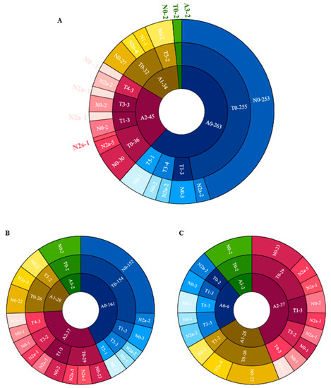 The distribution of different categories of atrophy, traction and neovascularization. (A) The distribution of different categories of atrophy, traction and neovascularization in the total cohort. (B) The distribution of different categories of atrophy, traction and neovascularization in the Pathological myopic group. (C) The distribution of different categories of atrophy, traction and neovascularization in participants with maculopathy.