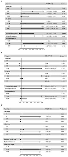 Associations between ocular parameters and the presence of atrophic maculopathy (A), tractional maculopathy (B), or neovascular maculopathy (C) in the multivariate adjusted models.