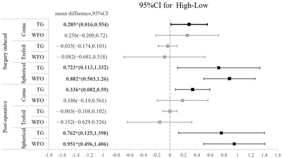 Forest plot of the standardized mean difference of surgically induced HOA or postoperative HOA between high myopia and low myopia on coma, trefoil, and spherical aberration with 95% confidence intervals stratified by TG vs. WFO.