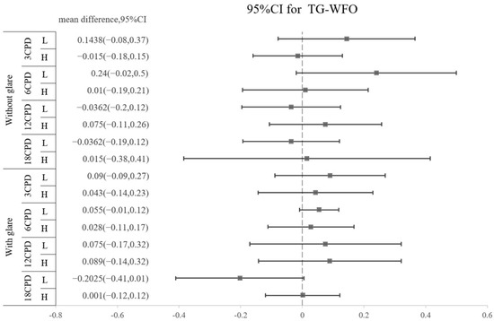Difference in postoperative contrast sensitivity between TG and WFO stratified by cycles per degree (3, 6, 12, and 18 CPD), glare (off and on) and level of myopia (high and low).