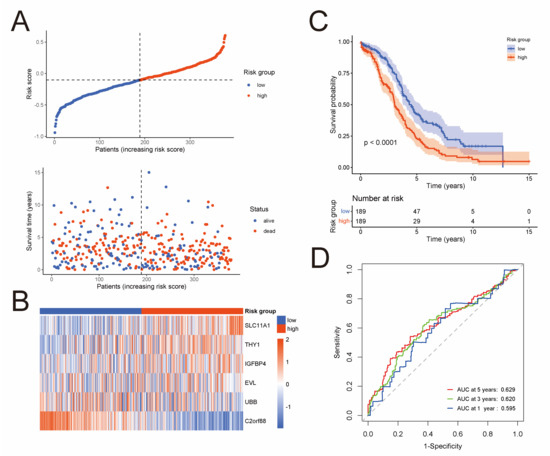 Development of a prognostic risk model based on the NK-cell DEGs in the TCGA cohort (n = 378). (A) Distribution of risk scores and survival status. (B) Heatmap shows expression level of the six genes forming the prognostic risk model. (C) Kaplan–Meier curves of survival analysis compares overall survival between low-risk and high-risk groups. (D) ROC curves of the prognostic risk model for predicting risk of death at 1, 3, and 5 years.
