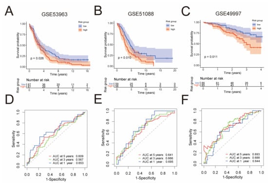 In order to validate the predictive capability of the prognostic risk model, three independent GEO cohorts were used, namely GSE53963 (n = 174), GSE51088 (n = 117), and GSE49997 (n = 171). By the Kaplan–Meier analysis, we found that the low-risk group had significantly superior overall survival than the high-risk group in each of these cohorts (Figure 3A–C). To assess the predictive accuracy of the prognostic risk model, area under the ROC curves for overall survival was calculated. In the GSE53963 cohort, mean AUC values of 1, 3, and 5 years are 0.653, 0.567, and 0.609, respectively (Figure 3D). In the GSE51088 cohort, mean AUC values of 1, 3, and 5 years are 0.695, 0.666, and 0.641, respectively (Figure 3E). Moreover, in the GSE49997 cohort, mean AUC values of 1, 3, and 5 years are 0.644, 0.688, and 0.693, respectively (Figure 3F).