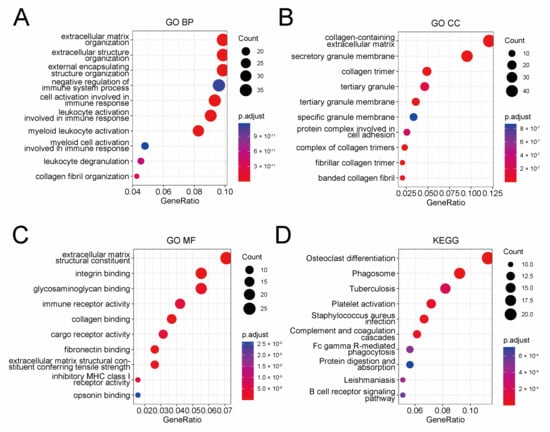 Functional enrichment analysis of 398 genes closely correlated with the prognostic risk model identified by Pearson correlation analysis. Dot plot of GO BP (A), GO CC (B), GO MF (C), and KEGG (D) analysis of these 398 genes. GO BP: biological process of gene ontology; GO CC: cellular components of gene ontology; GO MF: molecular function of gene ontology; KEGG: Kyoto encyclopedia of genes and genomes.