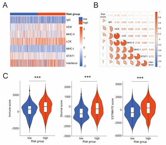 Association between the prognostic risk model and immune activities in tumor microenvironment. (A) Heatmap shows the GSVA score of seven clusters of metagenes representing different immune and inflammatory activities. (B) Correlogram exhibits the correlation between the risk score and GSVA scores of these metagenes. (C) Difference of immune score, stromal score, and ESTIMATE score between low-risk and high-risk groups by ESTIMATE algorithm. GSVA: gene set variation analysis; ESTIMATE: estimation of stromal and immune cells in malignant tumor tissues using expression data. ***: p-value < 0.001.