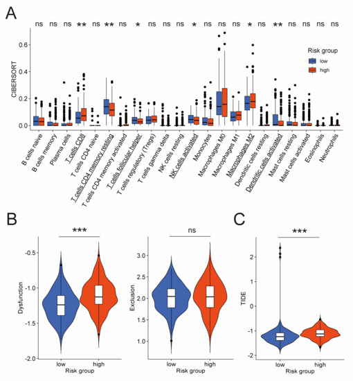 Evaluation of quantity and functional state of immunocytes in the TCGA cohort. (A) Difference of infiltration level of 22 immunocyte types between low-risk and high-risk groups by CIBERSORT algorithm. Names of cell types with significant differences are underlined. Difference of T cell dysfunction and exclusion score (B), and TIDE score (C) between low-risk and high-risk groups by TIDE algorithm. CIBERSORT: cell-type identification by estimating relative subsets of RNA transcripts; TIDE: tumor immune dysfunction and exclusion. *: p-value < 0.5; **: p-value < 0.01; ***: p-value < 0.001; ns: not significant.