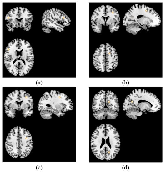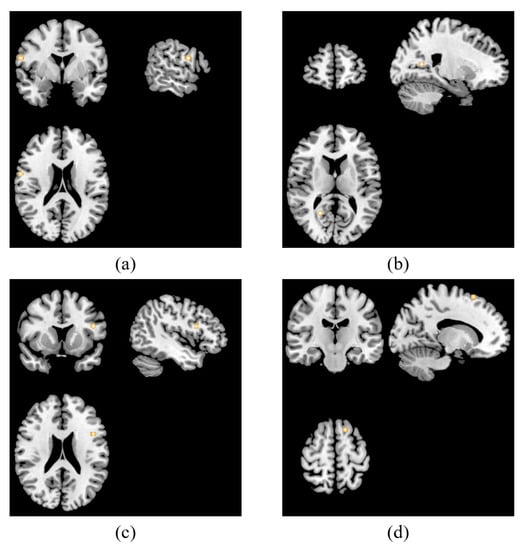 ALE results of resting-state studies. It showed that four clusters were activated associated with TMS treatment in patients with depression in the right precentral gyrus (x = 60, y = 0, z = 21) (a), right posterior cingulate (x = 21, y = 57, z = 12) (b), left inferior frontal gyrus (x = −46, y = 12, z = 22) (c) and left middle frontal gyrus (x = −15, y = −18, z = 63) (d).