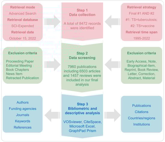 In this study, the Science Citation Index Expanded (SCI-E) of the Web of Science Core Collection (WOSCC) database was selected as an eligible literature source for the following reasons: (1) SCI-E can provide the document pattern needed for bibliometrics analysis software such as CiteSpace and VOSviewer; (2) SCI-E database is the most authoritative and highest standard global database, which researchers widely use. The research on the TB vaccine originated from the BCG vaccine more than 100 years ago [2,9,10]. However, early publications on TB vaccines were minimal due to poor publishing technology and information technology, and the data recorded in the database did not gradually increase until the middle of the twentieth century. In addition, the upper limit of the number of articles analyzed by VOSviewer and CiteSpace software and SCI-E database citation reports is 10,000. Therefore, the literature published between 1995 to 2022 was included in this study.