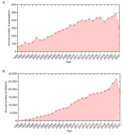 The data obtained from the SCI-E database were imported into Microsoft Excel 365 (Microsoft, Raymond, Washington, DC, USA) for further processing. This study mainly focused on the annual number of publications and citations, countries, journals, institutions, authors, citations, and keywords. The H-index and the cited frequency were evaluated using the citation report automatically generated by SCI-E. The H-index is calculated from h papers published by a scientist/country, each of which is cited at least h times [11,12]. This index is often used to assess the scientific research influence and productivity of researchers/countries.