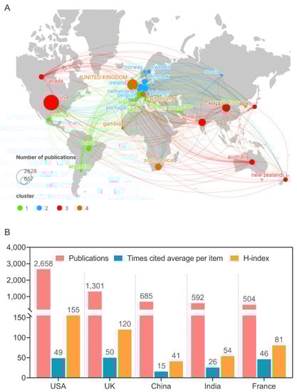 Furthermore, we also found that in terms of the number of publications (Figure 3), the USA, UK, and France were ranked in the top five, which might be closely related to their long-term, in-depth research on TB vaccines, advanced experimental equipment, and sufficient personnel and financial investment [59,60,61,62,63,64,65]. In contrast, among developing countries, only China and India made it into the top five, mainly owing to the realities of their high TB burden (Table S1). According to the report published by WHO in 2022, India is a significant contributor to the global incidence of TB, followed by China [1]. Interestingly, we found that although China and India ranked third and fifth in the world in terms of the number of publications, respectively, they fell down the rankings when measured by quality indicators (average citation frequency and H-index) for scientific contribution (Figure 3). These data indicated that the developed countries, led by the USA and the UK, are still leading the way in TB vaccine research, whereas the developing countries, led by China and India, are catching up and gradually increasing their impact on TB vaccine research.