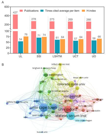 Based on the regional and country distribution of studies related to TB vaccines, we further explored the institutional distribution in TB vaccine research (Figure 4A). Results showed that: (1) In terms of the number of publications, the University of London (UL) was far ahead with 427, followed by the Statens Serum Institute (SSI, n = 278), London School of Hygiene Tropical Medicine (LSHTM, n = 273), University of Cape Town (UCT, n = 269), and University of Oxford (UO, n = 266); (2) In terms of the number of citations per publication, the SSI occupied the first place (n = 71), followed by LSHTM (n = 61), UO (n = 58), UCT (n = 57), and UL (n = 54); (3) In terms of the H-index, UL (76) > SSI (74) > UO (66) > LSHTM (64) = UCT (64).