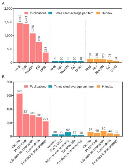 Top five funding agencies and their contributions to TB vaccine development. (A) The top five most active funding institutions in the field of TB vaccine. The output of the HHS and NIH was close to about 1400, NIAID got the highest number of cited times per article on average, and HHS got the highest H-index. (B) Times cited average per item, publications, and H-index of top 5 journals. Among the top five journals that published TB vaccine papers, Frontiers in Immunology received the highest IF (IF = 8.786). Regarding the number of journal publications, Vaccine ranked first with 629 articles. The average number of citations per article in Infection and Immunity was the highest (62.04). The H-index of Infection and Immunity was also the highest (80.5).