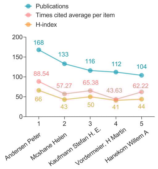 Figure 7 showed the top five prolific authors focused on TB vaccine research in the last 27 years, including Andersen Peter, Mcshane Helen, Kaufmann Stefan H. E., and Hanekom Willem A. Interestingly, Andersen Peter shared the highest number of publications (n = 168), the average number of citations per article (n = 88.54), and H-index (66) among all the authors.