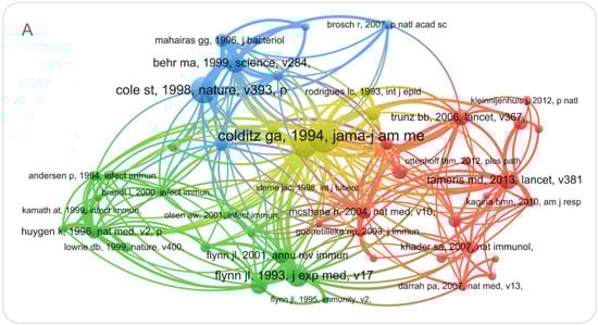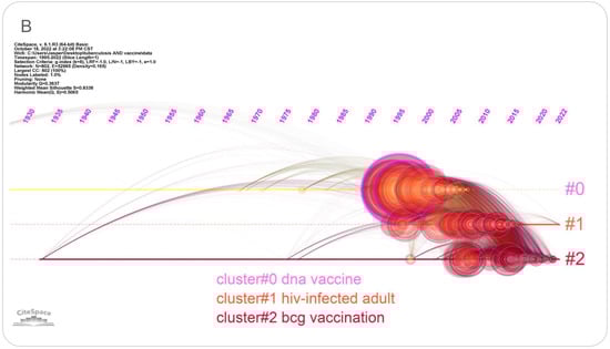 As shown in Figure 8A, the logarithmic likelihood ratio (LLR) was used to classify the research contents of all references into three categories, including cluster #0 (yellow color) DNA vaccine, cluster #1 (green color) HIV-infected adult, and cluster #2 (red color) BCG vaccination. (1) The largest cluster (#0) had 339 members, and three members received the most frequent citation, including “Efficacy of BCG Vaccine in the Prevention of Tuberculosis Meta-analysis of the Published Literature” published by Graham A. Colditz et al. in JAMA in 1994 (n = 804) [17], “Variation in protection by BCG: implications of and for heterologous immunity” published by P.E.M. Fine et al. in Lancet in 1995 (n = 643) [18], and “Deciphering the biology of Mycobacterium tuberculosis (M. tuberculosis) from the complete genome sequence” published by S. T. Cole et al. in Nature in 1998 (n = 623) [19]. (2) The second largest cluster (#1) had 236 members, and the most cited members in this cluster were “Immunology of Tuberculosis” published by JoAnne L. Flynn et al. in Annu Rev Immunol in 2001 (n = 355) [20], “The efficacy of bacillus Calmette-Guérin vaccination of newborns and infants in the prevention of tuberculosis: meta-analyses of the published literature” published by Colditz GA et al. in Pediatrics in 1995 (n = 321) [21], and “A multistage tuberculosis vaccine that confers efficient protection before and after exposure” published by Claus Aagaard et al. in Nature Medicine in 2011 (n = 315) [22]. (3) The third largest cluster (#2) had 227 members, and the top three members were “Safety and efficacy of MVA85A, a new tuberculosis vaccine, in infants previously vaccinated with BCG: a randomized, placebo-controlled phase 2b trial” published by Michele D Tameris et al. in Lancet in 2013 (n = 452) [23], “Effect of BCG vaccination on childhood tuberculous meningitis and miliary tuberculosis worldwide: a meta-analysis and assessment of cost-effectiveness” published by B Bourdin Trunz et al. in Lancet in 2006 (n = 384) [24], and “The success and failure of BCG—implications for a novel tuberculosis vaccine” published by Peter Andersen et al. in Nature Review Microbiology in 2011 (n = 363) [25]. We further analyzed references on the timeline based on CiteSpace. As shown in Figure 8B, in terms of the distribution of the entire timeline, the literature can be divided into three clusters: #0 DNA vaccine, #1 HIV-infected adult, and #2 BCG vaccination.