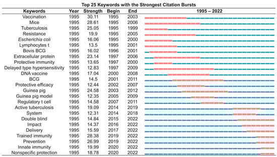 Burst detection is an algorithm developed by Kleinberg [34]. Kleinberg’s burst detection algorithm is considered a powerful tool to calculate and identify the frontier or emerging trend of research on the timeline. We use this algorithm to determine the key references and keywords related to the TB vaccines. As a result, the top 25 references with the most powerful citation bursts were identified via CiteSpace (Figure 9). Among the above 25 works of literature, the top one was a research article published by P Andersen in Infection and Immunity in 1994 [35]. This study evaluated the protective efficacy of a short-term culture filtrate (ST-CF) vaccine containing proteins secreted from actively replicating mycobacterial growth and found that the protective effect of the ST-CF vaccine was comparable to that of the standard BCG vaccine [35].