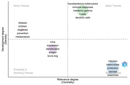 Thematic Map. In the thematic map, the horizontal axis represents the centrality, the vertical axis represents the density, and four quadrants were drawn accordingly. The words in the first quadrant (motor themes) indicate that they are essential to TB vaccine research and are well developed, representing the future development trend. The words in the second quadrant (Niche themes) suggest that although they have been well developed, they are not crucial for the current research field. The words in the third quadrant (emerging or themes) indicate that they may be new research fields that have just emerged or past research fields that are about to disappear. Finally, the words in the fourth quadrant (basic themes) indicate that they are essential to TB vaccine research but are not well developed.