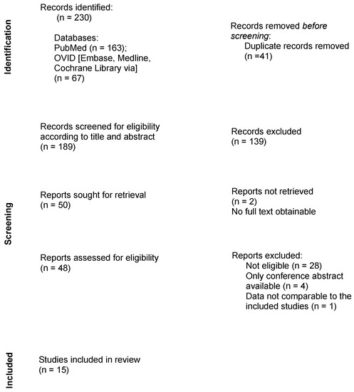 In total, 230 results were obtained during the research process. No additional records were identified through other sources. After removing duplicates, 189 studies remained. Fifteen publications met the criteria and were therefore included in this systematic review.