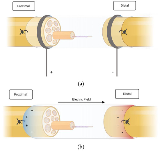 The following graphics (Figure 2a,b) illustrate the basic principle of the electrical stimulation performed in the included studies. Essentially, ES protocols can be divided into two groups. Most authors applied ES externally, i.e., via electrodes that were inserted aseptically to avoid contamination and infection [25,26,27,29,30,32,33,34,35,36,38]. Lin et al. [26,27], for example, placed a stainless steel electrode, which was connected to the negative output of a stimulator (cathode (−), into the knee; the anode (+) was positioned in the hip joint. Three authors, on the other hand, created implantable devices that had self-stimulating qualities [31,39,40]. These electroactive stimulators were able to generate an electric field and deliver currents through the nerve stumps without the need for an external stimulation source. A chronically implanted macro-sieve electrode inserted by MacEwan et al. [28] was connected to silicone conduits and stimulated via microwire leads, which were buried subcutaneously.