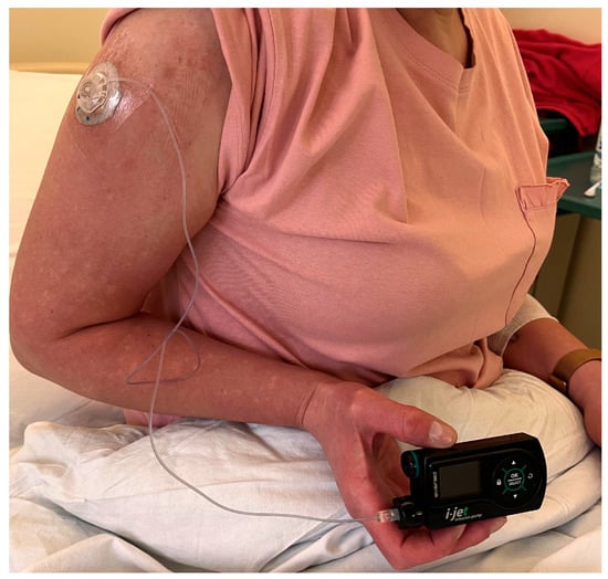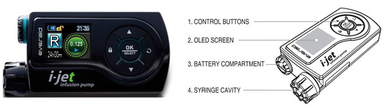 The I-Jet infusion pump is a CE marked infusion pump suitable for continuous subcutaneous infusion of liquid medicine (Figure 3) [12]. It has an icon-based color screen and is equipped with alarms and vibrations for patient safety. The pump runs quietly and continuously in the background 24 h a day. Treprostinil is stored in a 3 mL syringe inside the pump, which needs to be changed every 3 days [12].
